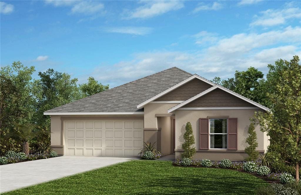 This captivating single-story home is sure to leave you in awe the moment you walk in. As you make your way down the entryway you will be greeted by beautiful tile flooring all throughout the common and wet areas. Discover a spacious great room with volume ceilings and a covered patio. The contemporary kitchen comes equipped with 36-in. upper cabinets, a Moen® Water Sense faucet, an eat-at island, laminate countertops, and a stainless-steel Whirlpool® appliance package. Near the entrance, you will find two secondary bedrooms, a secondary bath, and a designated laundry room. On the opposite end of the house is the primary bedroom, showcasing a linen closet, a dual-sink vanity with laminate countertop, and a walk-in shower with tile surround. Community offers no CDD, low HOA and is near highly rated Pasco County schools.