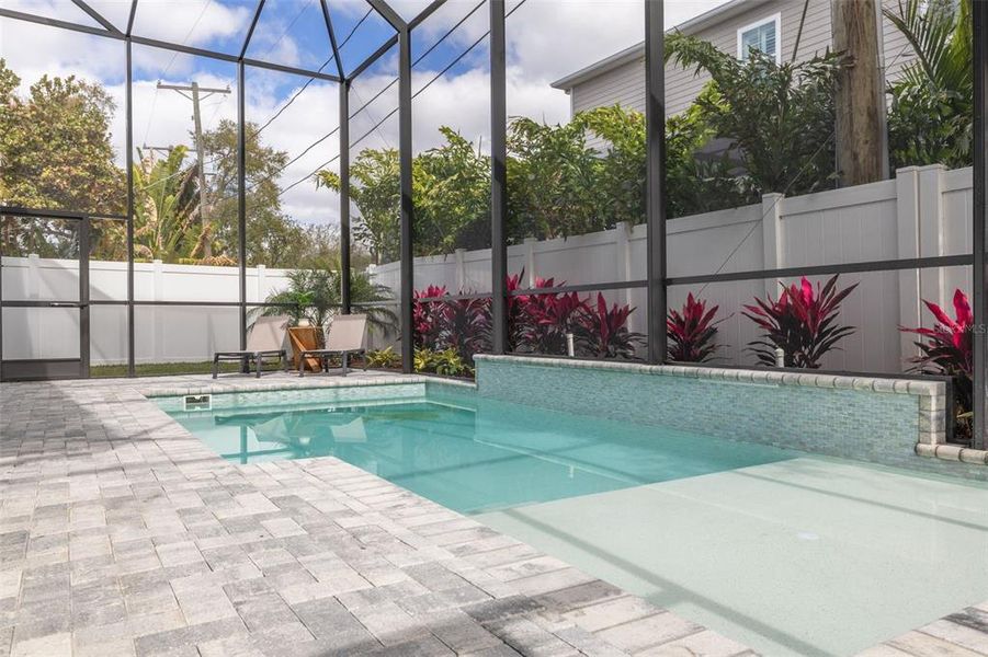 Outdoor living is private and intentional. The fully screened covered lanai with stacked stone accent wall overlooks a courtyard-style backyard designed for relaxation and entertaining. A sun-shelf pool with water features creates a tranquil focal point, while the upper-level covered porch includes an outdoor kitchen with beverage refrigerator and is prewired for television.