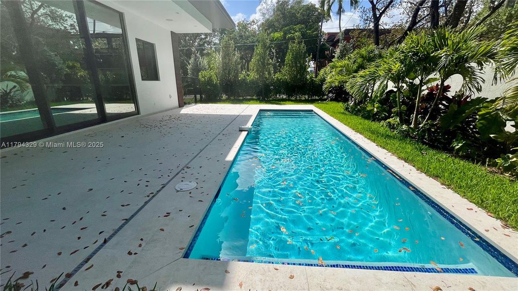 Brand new, stunning two-story single-family home on a corner lot with 4 bedrooms and 3.5 baths. Featuring a spacious one master suite on the first floor, all bedrooms offer ample space, walk-in closets, and beautifully designed bathrooms. Enjoy high ceilings, oversized Italian tile flooring, and custom wood panels. The open-concept kitchen showcases state-of-the-art appliances, man made quartz, and custom cabinetry throughout. Step outside to a private terrace and sparkling swimming pool, surrounded by lush landscaping. Additional highlights include impact windows, striking wood and metal staircase, custom wood front door, one-car garage, an expansive driveway, and a laundry room with sink and built-ins. Elegant & timeless design. Close to entertainment & schools, great neighborhood.