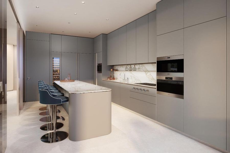The Italian-designed gourmet kitchens are appointed with sleek European countertops and a full Sub-Zero and Wolf appliance suite, including a concealed refrigerator and freezer, gas cooktop with ventilation, convection and steam ovens, wine fridge, and dishwasher, crafted for culinary excellence and aesthetic cohesion. Primary baths are spa-inspired sanctuaries, featuring freestanding soaking tubs and elegant Italian fixtures. Each residence also includes a full laundry room with a side-by-side washer and dryer.