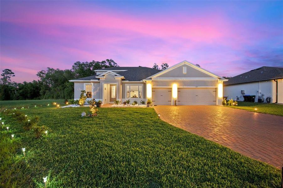 Located on a PREMIUM CORNER LOT, this 2025-built luxury home with a screened-in heated saltwater pool delivers the perfect blend of modern design, privacy, and high-end upgrades. With NO REAR OR LEFT SIDE NEIGHBORS and backing to a wooded conservation area, this property offers rare seclusion in a highly desirable setting. This stunning 5-bedroom, 4-bath home with a dedicated office/den and 3-car garage features a bright, open-concept layout with 10' ceilings, 8' doors, tray ceilings, wood-look tile flooring, 5 1/4" baseboards, and designer finishes throughout. Step inside to a formal dining area and a private office with French doors providing both elegance and functionality. The split floor plan enhances privacy, highlighted by a first-floor primary suite with direct access to the pool and patio, creating seamless indoor-outdoor living. The suite features a garden tub, an oversized walk-in shower, dual vanities, and a large custom closet. Upstairs, a private retreat includes a spacious bedroom and full bath, ideal for guests or multigenerational living.The chef's kitchen is built to impress, featuring a massive quartz waterfall island, built-in double ovens, a gas cooktop, premium stainless steel appliances, ceiling-height white cabinetry, and a walk-in pantry, designed for both everyday living and entertaining. A convenient pool bath with double sinks and an upgraded shower door offers direct backyard access. Step outside to your own private resort-style backyard on an oversized .36-acre lot, featuring a new screened-in heated saltwater pool, a sealed paver deck, ambient pool and outdoor lighting, lush landscaping, and recently planted Italian cypress trees that enhance both privacy and luxury appeal. The 3-car garage offers epoxy flooring, built-in storage, and an upgraded LiftMaster garage door, blending style with functionality. Additional upgrades include a water softener system, gutters, custom blinds, upgraded light fixtures, a shed, a pool privacy screen, a pest control system, security system and much more. With a minimal HOA, this home delivers the perfect balance of privacy, luxury, and location! Just 5 miles from Downtown Mount Dora and about 30 minutes to Orlando. A rare offering featuring a premium lot, new construction, a resort-style pool, and luxury upgrades throughout, truly move-in ready. POOL AND PATIO FURNITURE INCLUDED WITH FULL PRICE OFFER.