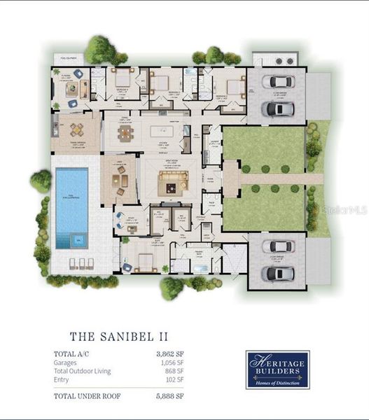 : Introducing The Sanibel II by Heritage Builders a distinguished estate-style custom home that exemplifies elegant design and fine craftsmanship. Situated on nearly half an acre in the coveted Oyster Bay area West of the Trail, this single-level 3,862 sq. ft. residence offers four bedrooms, four and a half baths, and an unmatched blend of sophistication and comfort. From the moment you enter the stately foyer, the home welcomes you with refined architectural details and luxurious finishes. The expansive great room flows effortlessly into the dining area and gourmet chef’s kitchen—an ideal space for entertaining or gathering with family. A private study provides a tranquil workspace, while a spacious media room offers the perfect venue for movie nights, gaming, or watching the big game. The lavish primary suite features generous walk-in closets and a spa-inspired bath designed to be your personal sanctuary. French doors open to a beautifully designed outdoor living area, perfectly merging indoor and outdoor living. Step through the oversized sliding glass doors to discover a private backyard oasis—featuring a sparkling pool and spa, a fully equipped outdoor kitchen, a covered lanai, and a veranda, all thoughtfully designed for relaxation and entertaining. Don’t miss this opportunity to own a one-of-a-kind custom home that offers the ultimate in luxury, style, and livability. Schedule your private tour of The Sanibel II today.