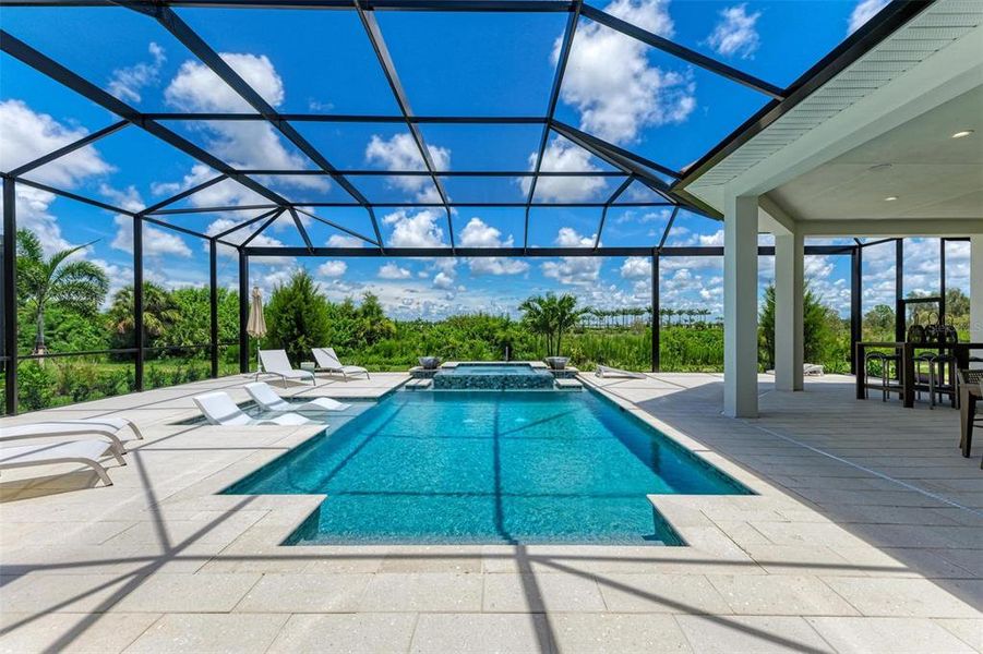 Lee Wetherington Homes gorgeous Caravel Model Home in Everly at Wellen Park is now available - fully furnished - for purchase with leaseback. This stunning custom home is styled with an inviting, sophisticated palette of soft blues and greys mixed with blonde wood tones. Luxurious details greet you as you enter through the double door entry: wood flooring with tile inlay, modern architectural elements, cast stone fireplace, and stunning 10ft sliders that pocket for easy access to over 750 s/f of covered outdoor living space. Spacious kitchen island with waterfall-edge quartz countertop, custom range hood, natural gas cook-top, and even a built-in coffee station in the pantry. Primary bedroom suite showcases elegant design details with LED accent lighting, custom built-in closets, and ensuite bathroom complete with marble tile shower and floors, free-standing tub & Venetian plaster ceiling detail. Outdoor living is accentuated with a stunning pool & spa overlooking a natural conservation area. Entertaining is a breeze with a flex-room outfitted as a wine bar that opens seamlessly to the outdoor kitchen/dining area. Everly is just minutes from the glorious Gulf Coast beaches that span from Venice to Boca Grande. Everly residents will enjoy exclusive use of the amenity center that includes a clubhouse for social gatherings, state-of-the-art fitness center, resort style pool with spa & private cabanas, chip & putt golf, four pickleball courts, and a gathering lawn for catching stunning sunsets with friends. Residents enjoy miles of connected walking trails, bike & golf cart paths, and numerous dining and social events hosted in Downtown Wellen Park. HOA fees include highspeed internet service and irrigation. List price includes all furnishings, electronics and artwork and 12 months leaseback.