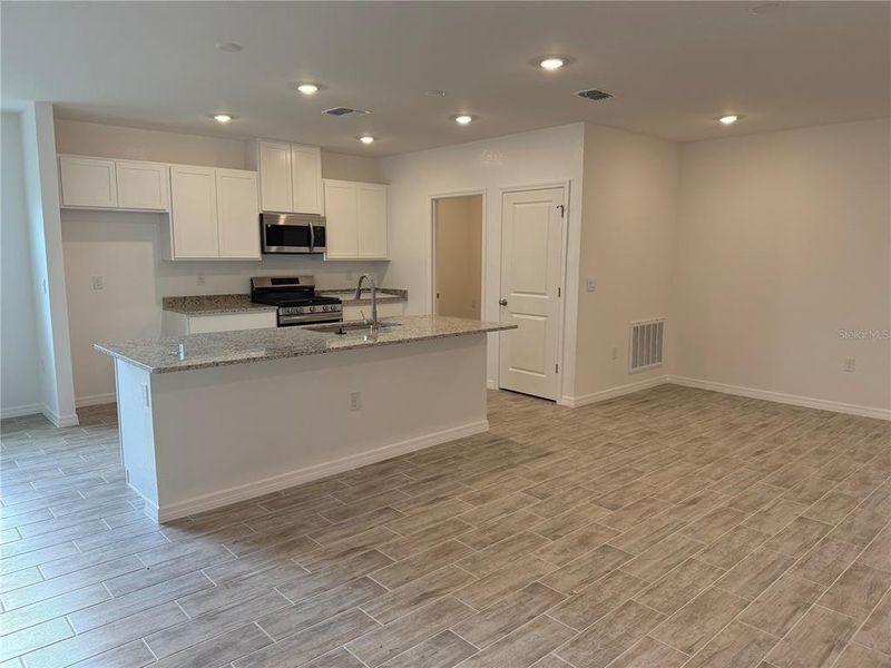 The kitchen is the heart of the home, featuring sleek granite countertops and natural gas for efficiency. This home is equipped with natural gas, offering convenience for cooking and heating. A versatile Flex Space at the back offers endless possibilities—dining room, office, playroom, or gym.