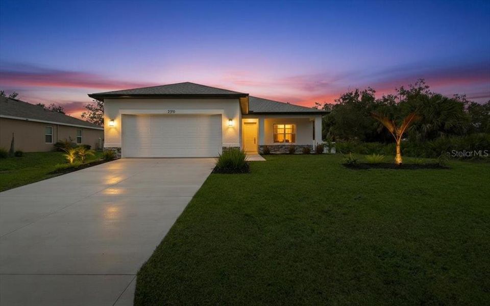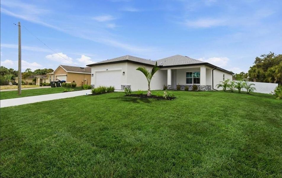 Welcome to your brand-new dream home in the heart of North Port! Built in 2025, this beautifully designed residence offers 3 bedrooms, 2 bathrooms, and a 2-car garage with spacious, thoughtfully planned living areas ideal for modern living. The open-concept layout creates a bright and inviting atmosphere, seamlessly connecting the living and dining spaces and showcasing luxury vinyl plank flooring throughout the main living areas and bedrooms, with tile in the bathrooms. The modern kitchen features Samsung stainless steel appliances, quartz countertops, and soft-close doors and drawers, with a refrigerator included—perfect for both entertaining and everyday enjoyment. Ceiling fans with remotes are installed in the living room and all bedrooms for added comfort. The owner’s suite is a private retreat with a walk-in closet and a spa-inspired en-suite bath, while two additional bedrooms provide flexibility for guests, family, or a home office. Additional storage includes a large linen closet near the secondary bathroom and a closet in the laundry room, which also includes a washer and dryer. The epoxy-coated garage floor enhances both durability and style. The fully fenced backyard features a brand-new solid vinyl privacy fence with two gates and offers room for a future pool and outdoor living, while front gutters add practical protection. Additional highlights include hurricane-impact windows and a hurricane-impact sliding glass door, Flood Zone X with no flood insurance required, no HOA and no CDD, and a prime location less than 5 minutes from I-75 and approximately 10 minutes to shopping and restaurants, as well as parks and Gulf Coast beaches. Schedule your private showing today and experience the best of Southwest Florida living.