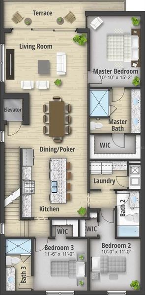 Each unit has a private elevator that will take you to one of three floors. The 2nd floor is comprised of 1,775 SF of climate-controlled area (plus screened terrace) featuring 3 bedrooms and 3 full baths, generous kitchen with island, living room, dining area and laundry room.