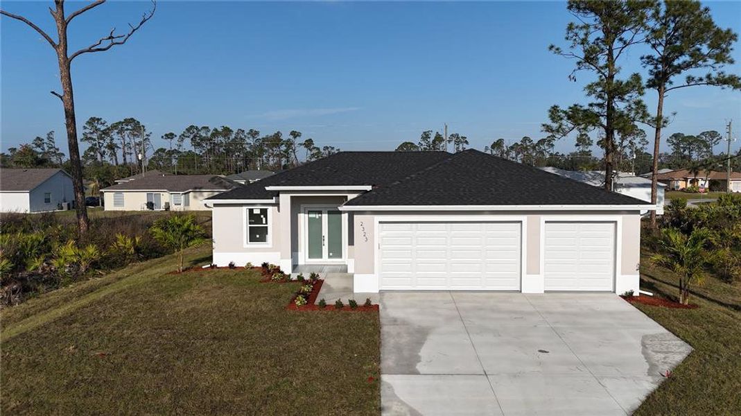 NEWLY CONSTRUCTED HOME -Tucked away on a quiet street in one of North Port’s most desirable neighborhoods, this beautifully maintained 3-bedroom, 2-bathroom and 3 CAR GARAGE with HURRICANE-IMAPCT WINDOWS, NO FLOOD ZONE (X ZONE) home offers the perfect blend of comfort, space, and Florida charm. From the moment you arrive, you’ll be drawn to the home’s clean curb appeal, mature landscaping, and serene north-facing front exposure, ideal for shaded afternoons on the porch.