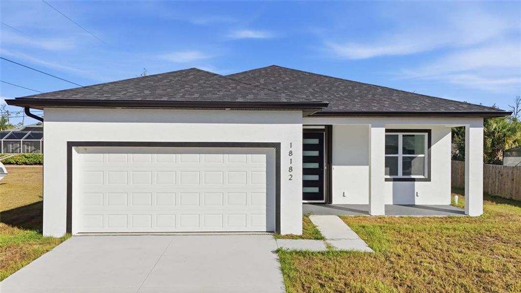 NEW CONSTRUCTION 3 bedroom, 2 bathroom, 2 car garage home in Port Charlotte. NO HOA FEES! CLICK ON THE VIRTUAL TOUR LINK 1 FOR THE VIDEO AND VIRTUAL LINK 2 FOR THE 3D TOUR. featuring a bright and open floor plan with high ceilings, recessed lighting, and tile flooring throughout. The open layout creates a seamless flow, making everyday living and entertaining easy and comfortable. The kitchen offers stainless steel appliances, Corian countertops, a breakfast bar, and a closet pantry, providing both function and efficiency. The primary bedroom includes a walk-in closet and a private bathroom with a single-sink vanity and a walk-in shower. Two generously sized guest bedrooms with built-in closets share a nearby full guest bathroom. A covered patio provides a simple yet inviting spot to enjoy your morning coffee or unwind with a favorite beverage. The backyard offers plenty of room to add your own personal touches and create an outdoor space to suit your lifestyle. MINUTES to US-41, Port Charlotte Beach Complex, local favorites such as Fishermen’s Village, Ponce De Leon Park, shopping & boutiques, fine & casual dining, and LIVE entertainment. Also just a short car ride to the Gulf Beaches of Boca Grande, Englewood, or Manasota Key to name a few where you will find world-class fishing and white sand between your toes. Schedule your showing TODAY!