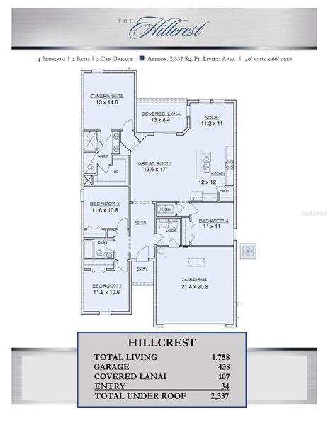 Sample Image The Hillcrest floorplan is a spacious and thoughtfully designed one-story home that includes 4 bedrooms and 2 bathrooms, complemented by a two-car garage. This layout features a large great room at the heart of the home, seamlessly flowing into the dining area and kitchen for easy entertaining and family gatherings. The owner's suite is privately positioned and includes a walk-in closet and an en-suite bathroom for added comfort. Three additional bedrooms share a full bath and are conveniently located on the opposite side of the home, offering a balanced layout. A covered patio extends the living space outdoors, ideal for relaxing or entertaining. With practical design elements and an open-concept layout, the Hillcrest floorplan combines functionality and comfort for a truly inviting home.