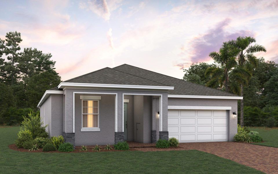 Introducing the Bennet, a thoughtfully designed single-story new construction home by Trinity Family Builders located in the desirable Eagletail Landings community in Leesburg, where modern design meets everyday comfort in a scenic Lake County setting. The Bennet floor plan offers four spacious bedrooms and two full baths across approximately 1,867 square feet of well-planned living space, making it ideal for families, retirees, or anyone seeking a functional yet stylish new home in Leesburg, Florida. This attractive stucco home features refined exterior detailing and a welcoming elevation that complements the quiet sophistication of Eagletail Landings, a natural gas community set near the southern shores of Lake Harris. Inside, the open-concept layout centers around a generous kitchen that flows seamlessly into the family and dining areas, creating an inviting environment for entertaining or relaxed daily living. The private primary suite serves as a peaceful retreat with a large walk-in closet and a spa-inspired Trinity Luxury Retreat Shower, while the additional bedrooms provide flexibility for guests, a home office, or multigenerational living. Thoughtful touches such as the exclusive Trinity Package Place add everyday convenience with secure outdoor storage and protected package delivery, while a covered front porch and rear lanai extend your living space outdoors for year-round enjoyment. Residents of Eagletail Landings enjoy access to a resort-style swimming pool now open, a shaded playground, and a convenient location with easy access to US-27, SR 19, and the Florida Turnpike, placing shopping, dining, schools, and recreation just minutes away. Surrounded by rolling hills and more than 1,000 lakes, this new home community offers a lifestyle that balances natural beauty with modern convenience, making the Bennet at Eagletail Landings by Trinity Family Builders an exceptional value for those seeking comfort, convenience, and contemporary Florida living.