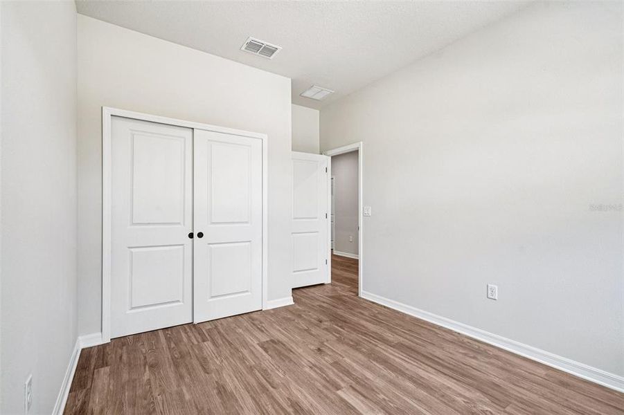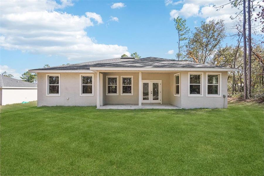 Luxury vinyl flooring runs throughout the entire home, complemented by LED flush-mount lighting, coordinated black door hardware, and window blinds throughout. French doors lead to the rear covered patio, extending the living space and enhancing indoor-outdoor flow.