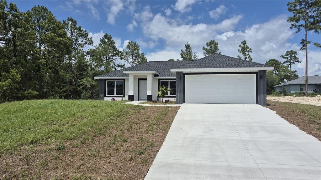 Welcome to this stunning new construction home nestled between Hwy 484 in Marion Oaks and Marion Oaks Manor. Offering 1,380 square feet of living space and a total footprint of 1,972 square feet, this thoughtfully designed residence sits on an oversized .29-acre corner lot, providing plenty of outdoor potential and privacy. Step inside to find vaulted ceilings in the social areas that enhance the home's open and airy feel. The kitchen is a showstopper with striking Calacatta marble quartz countertops, a dramatic waterfall island, and sleek black fixtures throughout. The cohesive modern design continues into the bathrooms, featuring matching quartz vanities and a spa-inspired rainfall shower in the primary suite. Additional features include...luxury waterproof vinyl plank flooring throughout, contemporary LED light fixtures and ceiling fan in the living room, and a 12x12 covered lanai perfect for relaxing or entertaining. This home offers the perfect blend of style, functionality, and value. Don’t miss your opportunity to own a beautiful new build in a growing area of Ocala! Your investment is protected with a full 1-year Builder Warranty. Pictures are of actual home.