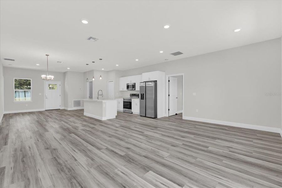 Don’t miss this incredible opportunity! Welcome to this stunning brand-new construction offering 1,865 square feet of thoughtfully designed living space. This modern 4-bedroom, 3-bathroom home features an open-concept layout filled with natural light, luxury vinyl flooring throughout, and high-end finishes that elevate every corner of the interior. The contemporary kitchen is a true highlight, equipped with quartz countertops, stainless steel appliances, sleek white cabinetry, and stylish pendant lighting above the expansive island – perfect for both everyday living and entertaining. The spacious primary suite offers a private retreat, complete with two walk-in closets and a spa-inspired bathroom featuring a freestanding soaking tub, a separate tiled shower with matte black fixtures, and a double vanity with quartz countertops. The additional bedrooms are generously sized, each with access to beautifully designed full bathrooms, providing comfort and privacy for family members or guests. The laundry room includes hookups for a utility sink and offers plenty of space for storage and convenience. Step outside through the sliding glass doors to a large backyard, offering ample space for entertaining, relaxing, or future customizations. Situated on a quiet street, this home delivers privacy, comfort, and modern elegance in one complete package. With no HOA restrictions, a two-car garage, and a long driveway, this property is ready for you to move in and enjoy all the benefits of new construction in a growing area.