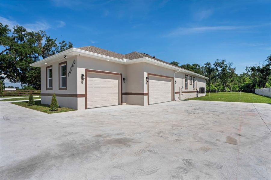 Welcome to Your Florida Home! Newly built in 2025, this stunning modern block home sits on a cleared, fully fenced 1.05-acre lot — beautifully sodded with lush grass, stately palm trees, and a few charming pines for that Florida touch. Step inside through an impressive 9-foot dual door entryway crowned with an elegant chandelier that welcomes you into over 4,600 total square feet of refined living space — including 3,375 sq ft under air with 4 spacious bedrooms and 3.5 luxurious baths. The expansive master suite is truly a private retreat featuring a large his-and-hers walk-in closet, a spa-like bathroom with double vanities, a soaking tub, and a stunning walkthrough triple shower. A second bedroom offers its own ensuite bathroom and walk-in closet, while two additional bedrooms share a convenient Jack-and-Jill bathroom layout — perfect for family or guests. Designed for entertaining, the open floor plan flows seamlessly from the formal living room to a dedicated office with built-in cabinetry, and into the grand family room and gourmet kitchen. The chef’s kitchen boasts an impressive 12’ x 6’ quartz island, extensive white cabinetry, and a complete set of premium KitchenAid stainless steel appliances, including a glass cooktop and sleek range hood. Outside, you’ll love the oversized 3-car garage and expansive wrap-around driveway, providing plenty of parking for family and guests. This is modern Florida living at its finest — spacious, stylish, and move-in ready!