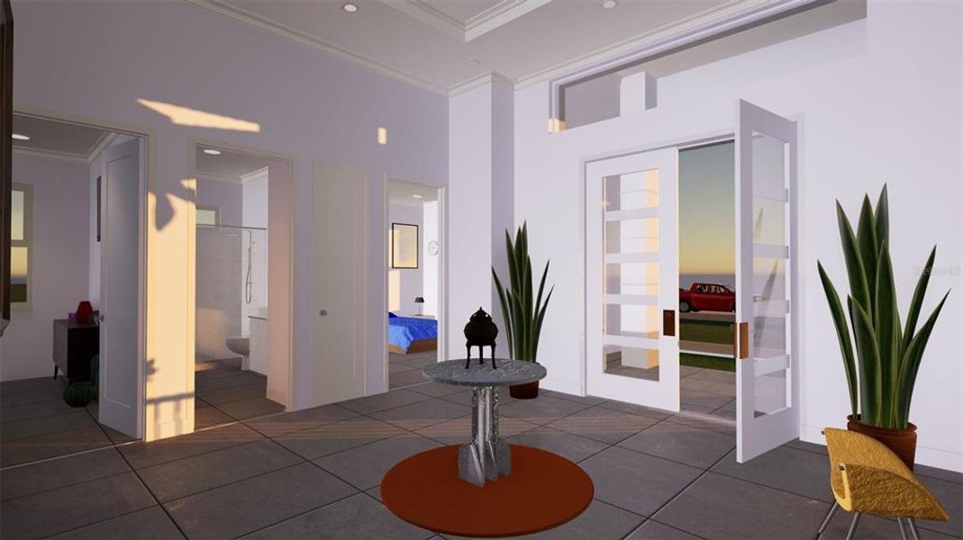 The house is designed to meet the new flood elevation code and is equipped with impact-resistant glass windows and doors to provide peace of mind. The flooring