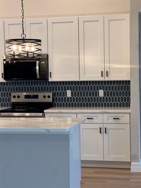 White shaker cabinets with 42" uppers in kitchen and bathrooms throughout