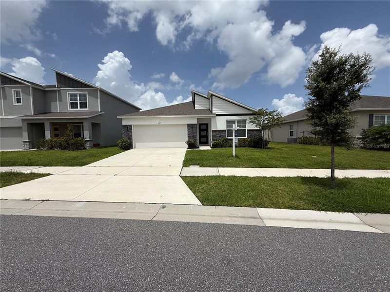 PRICE REDUCED!! Wake up to peaceful water views and sleek modern design in this beautifully appointed 4-bedroom, 2-bath home in the sought-after Summerly community of Saint Cloud. With striking contemporary curb appeal—highlighted by stacked stone accents—this home blends stylish finishes with everyday comfort. Inside, the smart 3-way split floor plan offers both space and flexibility. Two bedrooms and a full bath sit near the front of the home, while a third bedroom, laundry area, and garage entry are thoughtfully positioned off an open hallway. At the heart of the home, you’ll find an expansive, light-filled living area anchored by a stunning kitchen featuring quartz countertops, stainless steel appliances, shaker cabinetry, a timeless subway tile backsplash, and a large center island ideal for entertaining or casual meals. The dining area opens to an inviting lanai and large backyard, where you can take in beautiful water views—perfect for morning coffee, evening sunsets, or weekend gatherings. The private primary suite is a true retreat with elegant board and batten accents, peaceful backyard views, a spa-inspired bath with dual vanities, a walk-in shower, and a spacious walk-in closet. Design upgrades throughout include luxury vinyl plank flooring, a modern frosted glass front door, five-panel shaker-style interior doors, and stylish lighting and ceiling fans. Living in Summerly means access to a resort-style pool and cabana, playground, and scenic walking trails. Plus, you’re just minutes from Lake Nona, Medical City, major highways, and only 20 minutes from Orlando International Airport.