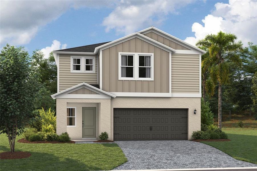 Prepare to be impressed by the Valencia, a two-story home featuring 5 bedrooms, 3 bathrooms, and a 2-car garage. This floorplan is designed for modern living and effortless entertainment. Step through the elegant foyer into a vibrant main living area, complete with a private guest suite for ultimate comfort. The kitchen shines with sleek quartz countertops, stainless steel appliances, and luxurious vinyl plank flooring overlooking the dining area which flows beautifully to the covered lanai through sliding glass doors. Upstairs, you’ll find the secluded owner’s suite complete with a walk-in shower, dual vanity and spacious walk-in closet. Conveniently located by the additional bedrooms is the cleverly designed oversized laundry room with new washer and dryer. Another modern feature of the Valencia is the smart thermostat with voice control, making energy efficient living a breeze. Outside, enjoy the chic elevation and professionally curated landscaping that adds the perfect finishing touch to this exceptional home.