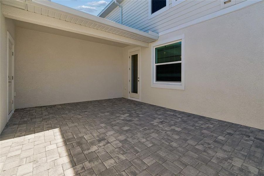 Ahead is the open dining room for gatherings. The great room, laundry room, and powder room sit off to the side. An oversized great room will comfortably host your loved ones, while the outdoor lanai is just steps away. Outside the Carmel is a tranquil courtyard with room for chairs or a dining set to enjoy the Florida weather and access to the 2-car garage.