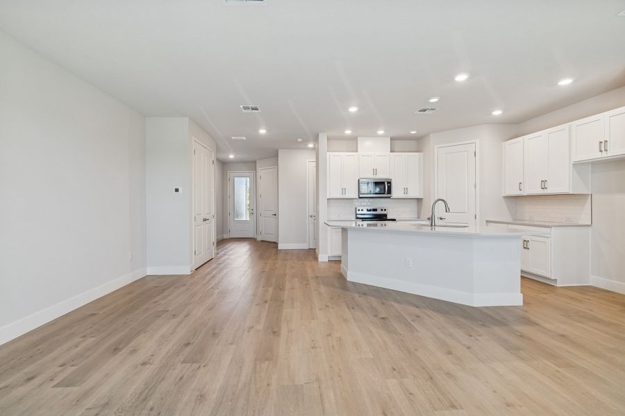 A corner pantry, full-function island, and expansive view of the main level contribute to the culinary layout of the contemporary kitchen. Your open floor plan offers an impeccable space to play host to picture-perfect memories and brilliant social gatherings.
