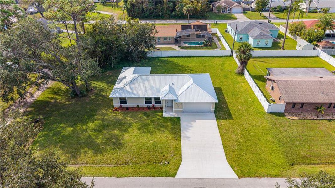 Discover a Timeless Haven: Brand-New 3/2 Masterpiece on a Rare, Oversized Sanctuary Elevated high above the ordinary, this enchanting sanctuary whispers promises of eternal serenity—private, flood-zone free, and cradled on a premium 120x125 lot. A lush southern buffer envelops you in ultimate seclusion, where the world fades away, leaving only tranquility and the gentle embrace of nature. This expansive home site is a canvas for your dreams: ample space for RV and boat parking, a resort-style pool shimmering under starlit skies, or a blooming garden oasis where love stories unfold. Step inside to pure elegance, where a sweeping open-concept design dances into a sun-drenched family room, bathed in golden light. Floor-to-ceiling sliding glass doors beckon you outward, spilling onto an expansive entertainer’s patio and a serene backyard retreat. Crowned by a brand-new 50-year metal roof, this home exudes timeless curb appeal and lifelong durability, a steadfast guardian of your shared memories. At its heart lies the gourmet chef’s kitchen, a symphony of gleaming granite countertops and a stunning oversized breakfast bar, where mornings linger over coffee and evenings with friends make a great gathering point. Premium stainless steel appliances gleam alongside designer cabinetry with soft-close drawers, inviting culinary adventures hand-in-hand. Luxury vinyl plank flooring—waterproof and lifetime-warrantied—flows gracefully through the main living areas, while plush, stain-resistant carpeting cradles your footsteps in every bedroom, a soft invitation to unwind. Oversized walk-in closets in each bedroom offer hidden treasures of space, and pre-wired setups for cable and streaming in all bedrooms and living rooms ensure seamless connections to your favorite escapes. Indulge in the interior laundry, complete with a deep utility sink, thoughtfully nestled between the kitchen and garage for effortless harmony. Built for modern luxury and unwavering peace of mind, ceiling fans in every room stir gentle breezes for year-round comfort. A brand-new professional survey is included, ensuring your confidence in the boundaries of your homestead. Nestled in a pocket of other beautiful and well-kept homes, this is more than a residence, it is your private sanctuary, a haven where you can live, play and enjoy the Florida lifestyle. Close to shopping, airports, and of course the ocean. Schedule your VIP tour today and let your story begin.