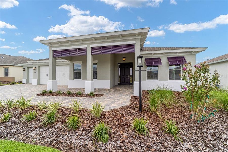 Welcome to the Arlington model, a brand-new construction home in the sought-after community of On Top of the World. Featuring 3 bedrooms, 3 bathrooms, and a 3-car garage, this residence blends elegant design with modern functionality. From the moment you arrive, you’ll notice the paver driveway and walkway, enhanced by beautiful landscaping. Inside, the home is finished with tile flooring, tray ceilings, and window blinds throughout. The open living area offers plenty of natural light and features two sets of sliding glass doors that lead to the screened lanai, perfect for indoor/outdoor living. The chef’s kitchen is beautifully appointed with staggered cabinets with crown molding, quartz countertops, backsplash, under-cabinet lighting, built-in oven and microwave, 5-burner cooktop with range hood, stainless steel refrigerator, and a walk-in pantry. The primary suite is a private retreat, showcasing a tray ceiling, a 3-panel window overlooking the backyard, and a huge walk-in closet that connects directly to the laundry room. The luxurious en suite features a double vanity sink, a zero-entry tiled shower with a built-in bench, and a linen closet. One guest bedroom also enjoys its own en suite bathroom with a single vanity sink and a tiled shower with a sliding glass door, while the third bedroom is conveniently located near the third full bath. Enjoy Florida living year-round on the covered and screened lanai. The 3-car garage provides ample room for vehicles, storage, or hobbies. Nestled within the gated community of On Top of the World, residents have access to world-class amenities including golf courses, fitness centers, swimming pools, tennis and pickleball courts, walking trails, and endless social activities. Don’t miss the opportunity to make this brand-new Arlington model your forever home! Call for your private showing today!