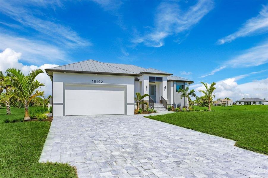 Notable (exterior) features include: Privacy wall stubbed out with water & electric for future outdoor kitchen.. which also doubles for privacy just outside the master bedroom, fully automated Pool feature that gets programmed once Wi-Fi is brought to the home, "Picture frame" pool cage, custom wood-like vinyl planks on lanai ceiling, Brick paver driveway, Beautiful Rain Glass double entry doors, hand rail up the steps leading to front door as well as down from Pool lanai to rear of property, custom Bahama shutter above front entry, accent brick on front pillars, Epoxied garage floor, Metal Roof & Flat panel garage door!