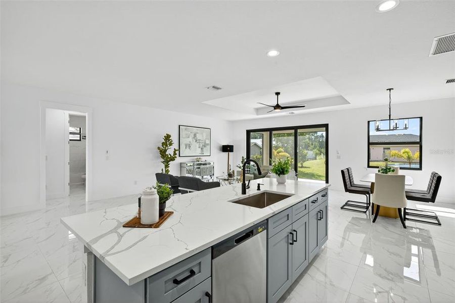 Welcome to this beautifully crafted new construction home, where every detail has been thoughtfully curated to convey the perfect blend of comfort, elegance, and high-end finishes throughout. As you arrive, you’ll appreciate the hurricane impact windows and doors, providing both security and peace of mind. Step inside and you’re immediately greeted by an open, airy floor plan accented by porcelain tile flooring throughout and an abundance of natural light that enhances the spacious feel of the home. The heart of the residence is the expansive kitchen and great room—an ideal setting for both entertaining and everyday living. The kitchen showcases tall cabinetry, sleek quartz countertops, stainless steel appliances, and a generous island perfect for gathering with family and friends or preparing meals with ease. As you move through the great room, your eye is drawn to the impressive four-panel sliding glass doors that fully open to the screened-in lanai, seamlessly blending indoor and outdoor living. Tray ceilings in both the great room and the primary suite add architectural depth and elegance. The oversized primary retreat is designed for true relaxation, featuring his and hers walk-in closets, dual vanities with individual sinks and matching quartz countertops, a frameless glass-enclosed shower, and a deep freestanding soaking tub—perfect for unwinding at the end of the day. A spacious den offers flexibility for a home office, playroom, media room, or hobby space. Ceiling fans in the primary bedroom, great room, and lanai provide year-round comfort, while the irrigation system keeps your landscaping looking its best with minimal effort. Conveniently located near SR-82 and I-75 for easy commuting, this exceptional home showcases quality craftsmanship, modern design, and functional living spaces. Don’t miss the opportunity to make this stunning new home your own. Pictures are from a previous model, colors may be different and the layout is reversed.