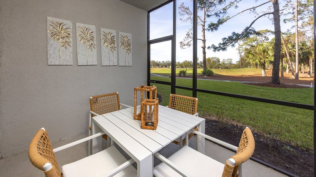This single-story condo is the largest plan in the collection. Near the foyer are a guest bedroom and den, which can also double as a bedroom. The kitchen has a dining room tucked to the side and opens to the living room with access to a lanai. The owner’s suite is situated toward the back of the home for privacy, complete with an attached bathroom and walk-in closet.