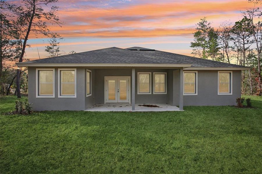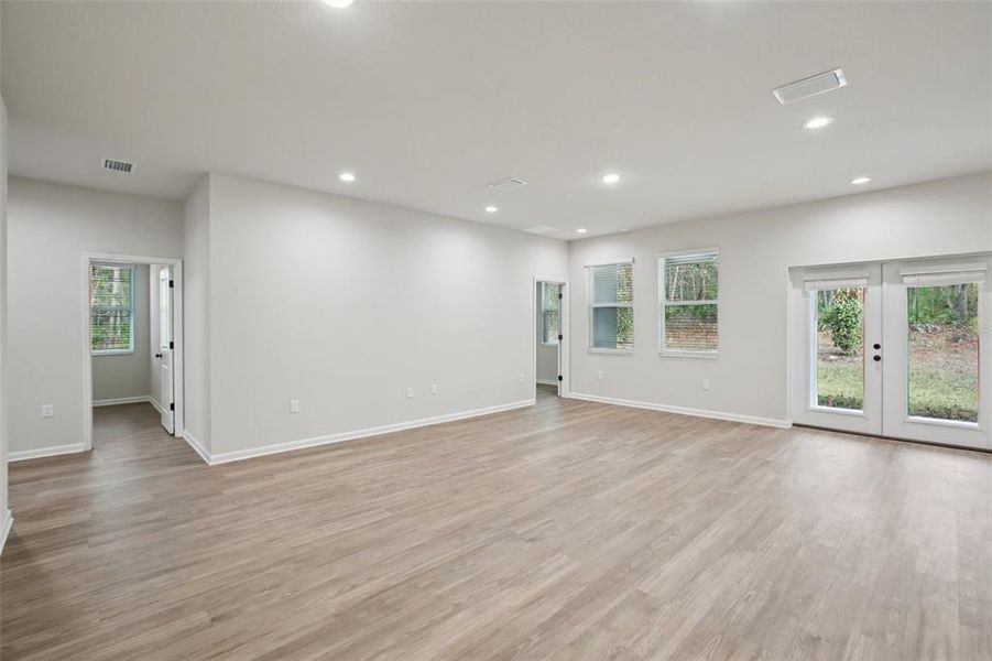 Luxury vinyl flooring runs throughout the entire home, complemented by LED flush-mount lighting, coordinated black door hardware, and window blinds throughout. French doors lead to the rear covered patio, extending the living space and enhancing indoor-outdoor flow.