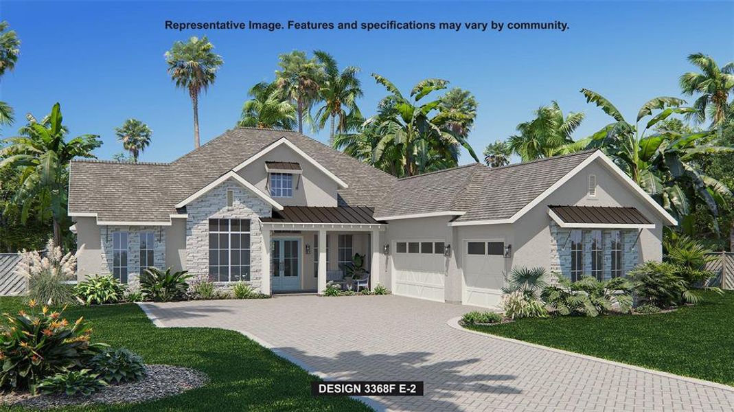 A front porch leads into the main entryway, featuring a coffered 12-foot ceiling. French doors open to a private home office with views of the front yard. A secluded guest suite with a full bathroom and walk-in closet is located off the main hallway. The open family room is bathed in natural light from a sliding glass door that opens onto the backyard covered lanai. The dining area connects the family room to a kitchen that includes an island with built-in seating, generous counter space, and a walk-in pantry. Adjacent to the kitchen, a game room with two walls of windows offers a bright, versatile space. The primary bedroom, a peaceful retreat, is framed by a wall of windows. French doors lead to the primary bathroom, complete with two walk-in closets, a linen closet, dual vanities, a freestanding tub, and a large glass-enclosed shower. Each secondary bedroom includes a private bathroom and walk-in closet. The laundry room is centrally located, and a mudroom is situated off the three-car garage.