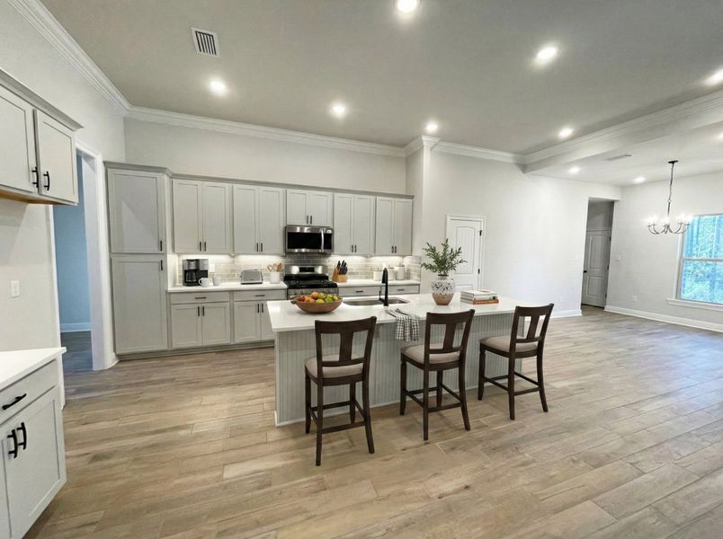 soft close doors and drawers, undermount cabinet lighting, upgraded kitchen backsplash, LED coach lights on each side of the garage, and more!