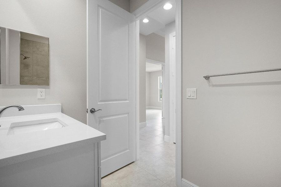 This welcoming 2 bedroom, 2 bath plus den home provides soothing colors indoors and out. The Island elevation with 4' garage extension is accented with blue and white tones. The interior is inviting with white and grey tones in the kitchen with upgraded tile backsplash, glass cooktop and double wall oven, plus 3 boxes above the kitchen island for future pendant lights. The laundry room is finished with upper and lower cabinets including a drop-in laundry tub. The office is accented with double single-lite glass French doors. Pocket door at master bath water closet. Tile flooring throughout the home plus a floor outlet and 4 hi hats in great room. The lanai is finished with an exterior wall mount TV package.