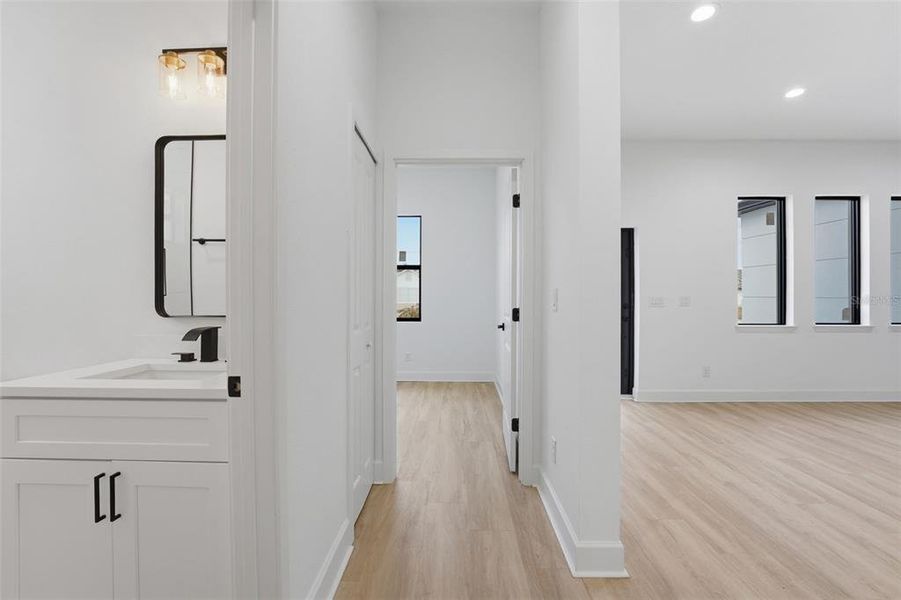 Impact-resistant windows enhance energy efficiency while providing a quiet, comfortable interior. The primary suite includes a walk-in closet and private bath with clean, modern finishes. Additional bathrooms continue the home’s fresh, contemporary design.
