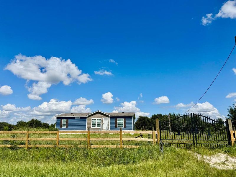 HOME~HOME on the RANGE! Perfect location! 2025 Scotbilt 3 Bd/ 2Ba, DWMH. Open concept, split plan, knock down/drywall interior and can lighting. Island kitchen, pantry, SS appliances. Master suite with walk in closet, soaking tub and separate shower, and double sinks. Large wrought iron gate and 3-board fence entrance. Beautifully cleared, with several oak trees. 1.25 Ac, fully fenced. Only 5 lots from paved road on 246th. Best Location! High and dry. EXCEPTIONAL!