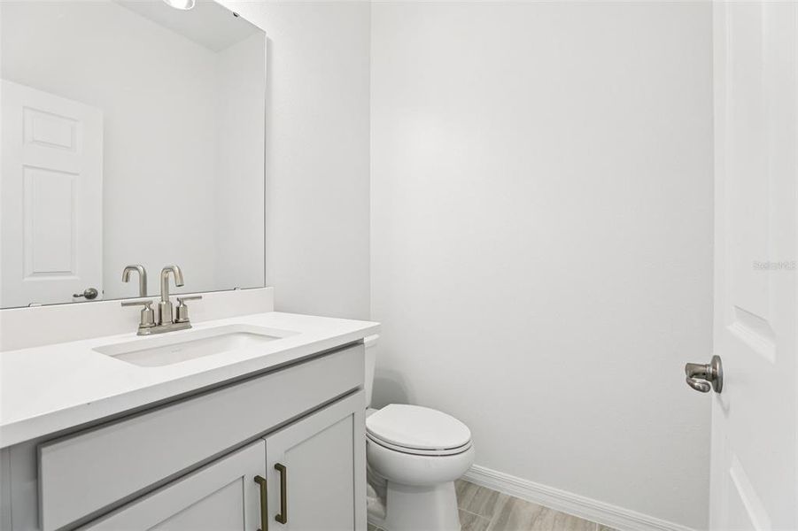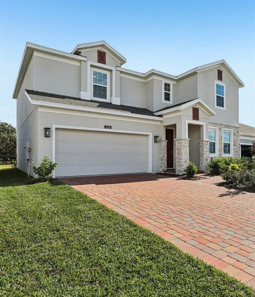 This Move-In Ready home is our only Newcastle plan available with conservation views! Discover this exceptionally designed floorplan featuring 5 bedrooms and 3.5-baths perfectly situated on a beautiful homesite with no rear neighbors for added privacy. Featuring 9'4" ceilings on the first floor and a convenient first-floor Guest Suite with a full bath and walk-in closet, this home offers an open-concept layout ideal for modern living and entertaining. The well-appointed kitchen includes upgraded 42" cabinets with crown molding, quartz countertops, a stylish tile backsplash, large walk-in pantry closet, and stainless steel appliances. Enjoy indoor-outdoor living with a dining area that opens to a covered rear Lanai. Elegant tile flooring enhances the main living areas on the first floor, and window blinds are included throughout. The luxurious Primary Suite features an en-suite bath with dual sinks, quartz countertops, a walk-in closet, and a beautifully tiled walk-in shower. Curb appeal is complete with attractive landscaping, and a brick paver driveway and welcoming lead walk. Trinity Place amenities include resort-style pool and cabana, a shaded tot lot for the little ones, and a convenient dog park. Community is conveniently located near Shopping and Dining, with easy access to major thoroughfares and just a short drive to Disney.