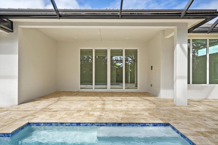 3-bedroom, den, 3 bath pool home, A dramatic 12'8'' foyer ceiling and coffered ceilings. 8 ft solid core interior doors and an 8 ft dining room window enhance the home's spacious feel. Gourmet kitchen, quartz island, premium appliances, and the convenience of natural gas cooking-a chef's dream! Expansive 10 ft impact sliding glass doors creates a stunning wall of glass that fills the home with natural light while offering effortless access to the outdoors. The view opens to a spacious covered patio, with travertine decking, Pool with a screen enclosure.