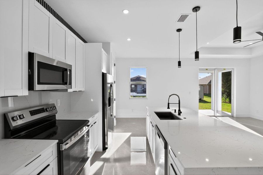 Discover the perfect blend of modern design and quality craftsmanship in this brand-new 3-bedroom, 3-bathroom home in Cape Coral. Thoughtfully designed for comfort and function, the open-concept layout features high ceilings, abundant natural light, and a seamless flow between the kitchen, dining, and living areas. The kitchen offers premium cabinetry and luxury countertops — ideal for cooking and entertaining. Each bedroom is well-sized for comfort, with the primary suite featuring dual vanities and a walk-in shower. The spacious outdoor area provides room to add a pool or enjoy peaceful evenings under the Florida sun. Built with care and attention to detail, this home delivers modern living at its best in a desirable and growing neighborhood.