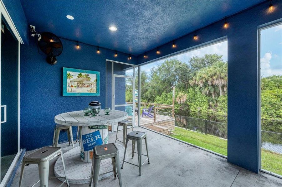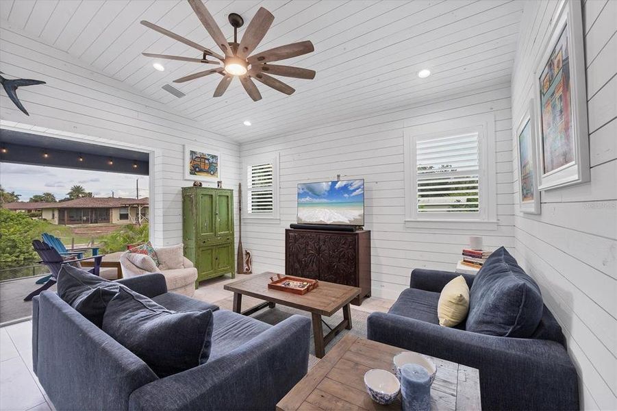 From the moment you arrive, the vibrant blue exterior and sunshine yellow door set the tone for what awaits inside. Step into a bright, open living space wrapped in shiplap, filled with natural light, and framed by vaulted ceilings that give the home an airy coastal feel. Pocket sliding doors create a seamless connection between indoors and out, opening to a screened lanai and spacious patio surrounded by tropical landscaping, perfect for gatherings or quiet mornings by the water.