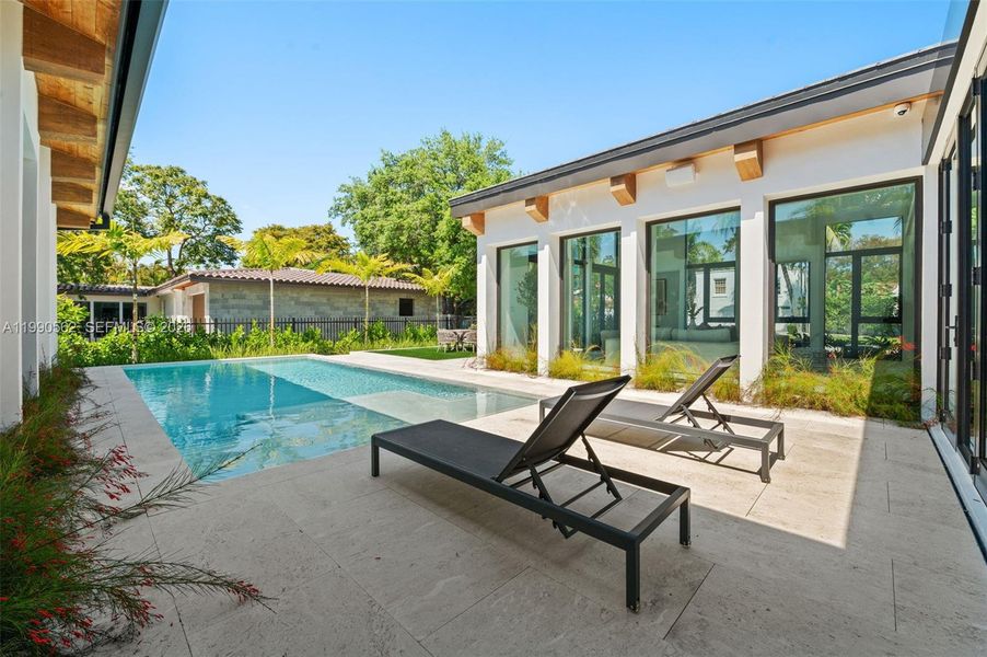 Newly completed Mediterranean modern residence in Coral Gables, set on a 15,750 SF oversized lot. Designed around a series of private courtyards, this 6-bedroom, 6-bath home offers 5,129 SF of living space with a seamless indoor-outdoor layout. A central atrium, expansive glass walls, and 35’ x 15’ pool create a natural flow between interior and exterior spaces. Interior features include high ceilings, coral rock accents, and refined wood finishes. Ideally located east of US-1 near Riviera Drive and the Gables Waterway, the property offers privacy, landscaped grounds, and covered parking.