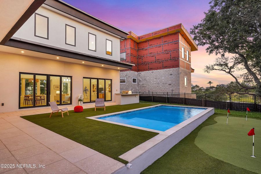 Welcome to 150 Morgan Avenue, a brand new 2025 custom-built modern home located in the desirable Surfside neighborhood of Vilano Beach. This thoughtfully designed residence offers over 3,200 square feet of refined coastal living with 4 bedrooms, 3.5 bathrooms and a spacious 2 car garage. Situated on a quiet dead-end street with no HOA, the property offers privacy, serenity, and marsh views. The home features two luxurious primary suites, one on the main floor and one upstairs, ideal for multi-generational living or guest accommodations. High-end finishes include concrete floors downstairs, engineered hardwood floors upstairs, and a premium stainless steel Bosch appliance package in the kitchen. Hurricane impact windows and doors provide security and peace of mind. Outdoor living is a highlight, with a heated saltwater pool, private putting green, summer kitchen and an outdoor shower, perfect for entertaining or relaxing after a day at the beach.