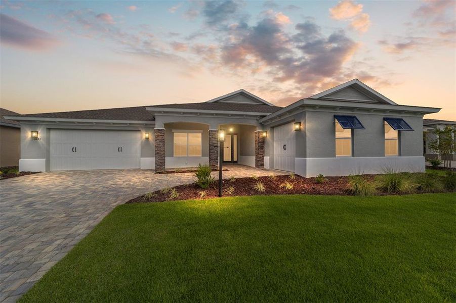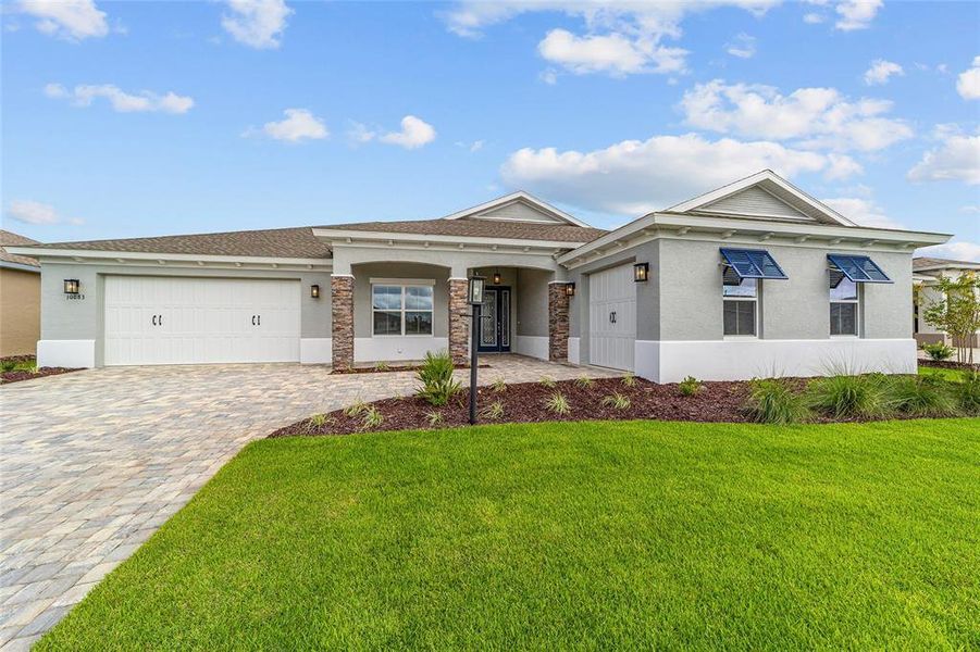 This exquisite new construction home offers 3 bedrooms, 3 bathrooms, over 2,300 sq. ft. of living space, and a split 3-car garage. The home is enhanced by a paver driveway and walkway with lush landscaping, creating a welcoming entrance. Inside, the open floor plan with tray ceilings creates a bright and spacious living area. Entertain effortlessly with a gourmet kitchen featuring premium white staggered cabinets with crown molding, under-cabinet lighting, a walk-in pantry, built-in oven and microwave, and a 5-burner cooktop with range hood. A separate wet bar with wine cooler adds a touch of luxury. 4-panel sliding doors lead to a screened lanai, perfect for enjoying Florida’s beautiful weather. Located in the highly desirable Balfour neighborhood within Ocala’s premier 55+ community, On Top of the World, this Dunbar Model blends modern design, elegance, and functional living in every detail. Call for your private showing today!