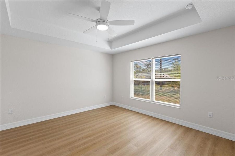 The luxurious master suite offers a true retreat with a recessed tray ceiling, ceiling fan, and blinds on the windows. The ensuite bathroom is elegant with tile floors, a curb-less oversized walk-in shower with designer tile walls, a pebble floor, recessed shampoo niche, dual vanity sinks with quartz countertops, and brushed nickel single-lever faucets. The large walk-in closet includes ample shelving and shoe storage. The second and third bedrooms are generously sized, featuring large windows with blinds, ceiling fans, and closets with additional shelving.