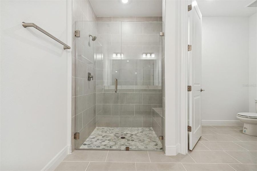 The owner's suite shares this wing of the house. The bedroom leads into the bathroom with dual vanities, a walk-in shower, and a spacious walk-in closet.