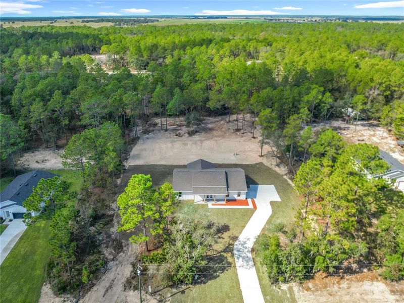 Brand-New Home in Rollins Hills! Beautiful new construction featuring 3 bedrooms and 2 bathrooms on over one acre of land. Bright open layout with high ceilings, tile flooring throughout, and spacious living and dining areas offering a full view of the lanai and backyard garden — perfect for relaxing or entertaining. The kitchen includes quartz countertops and stainless-steel appliances. Oak wood beams add warmth and character to the living and dining area. Enjoy plenty of outdoor space and the peaceful charm of rural living, while still being close to everything you need. A perfect home offering comfort, space, and a relaxed Florida lifestyle.