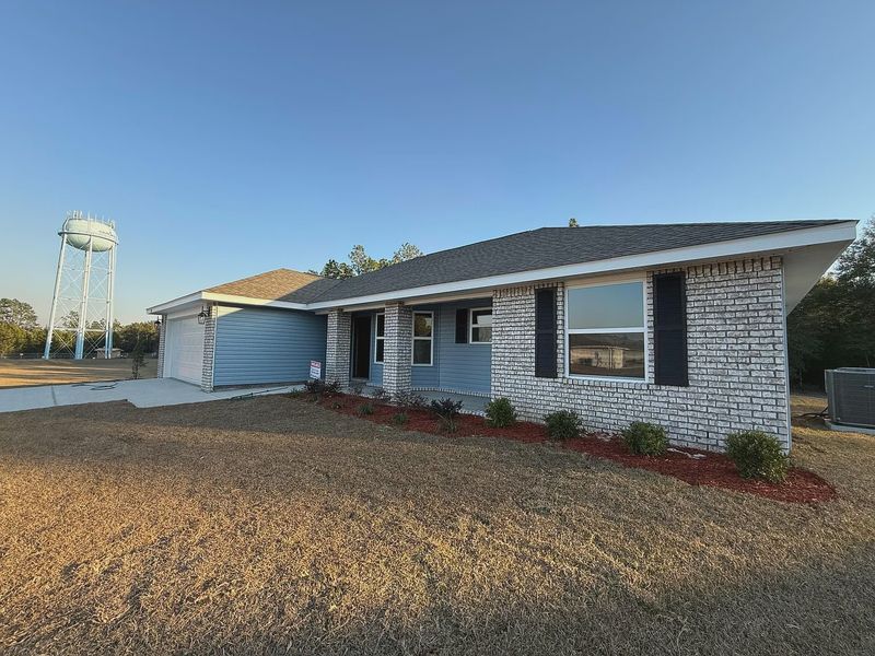 This 1605 sq ft home will feel much bigger as you enter. Both dining and living rooms have cathedral ceilings. The kitchen overlooks the living room and has a lot of counter space! You'll see a lot of natural light coming in as the living room has 3 windows as well as a door out to the large, covered porch, a window in the kitchen and a bay window in the dining area. This is a split bedroom plan. The master bath has both a garden tub with window and a separate walk-in shower. All wet area floors are adorned with an upgraded flooring called Puretec. All other rooms have carpet. The exterior is front sided brick with 3 sided maintenance free vinyl. This home comes with a 10 yr Bonded Builders warranty.