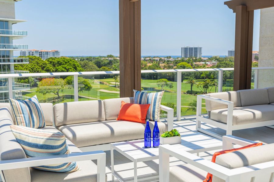 Expansive walls of floor-to-ceiling glass capture panoramic breathtaking views of The Boca Raton Resort's emerald fairways and the azure Atlantic Ocean, seamlessly inviting the captivating, serene vistas of the natural surroundings infused into the interior living spaces. The expansive great room, encompassing living, dining, and media areas, is bathed in natural light and framed by 11-foot± tray ceilings with concealed recessed linear lighting, creating a sense of airy grandeur.