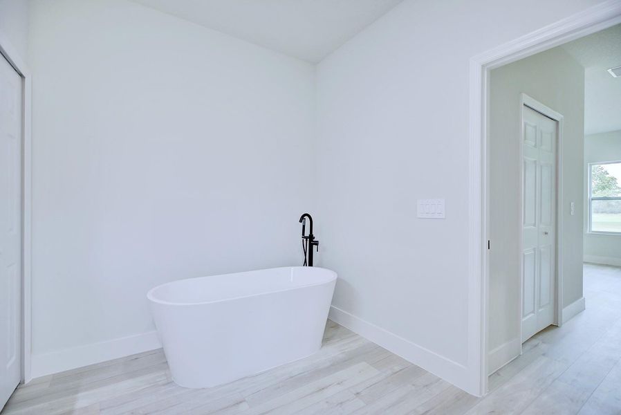 Experience luxury living in this brand-new 4 bedroom, 4 bathroom home, perfectly situated in the beautiful golf course community. It showcases modern upgrades, and an open floor plan enhanced by soaring 11-foot cathedral ceilings and luxury vinyl flooring throughout. The kitchen is a true showpiece featuring sleek cabinetry, beautiful countertops, a designer tile backsplash, a waterfall island with bar seating, a farmhouse sink, stainless steel appliances. Primary suite complete with his-and-hers closets, dual quartz vanities, a spacious walk-in shower, and a spa-like freestanding soaking tub. Additional highlights include an indoor laundry room, a covered back patio, a spacious 3-car garage, and a large backyard ideal for gatherings, outdoor living, or future pool plans.