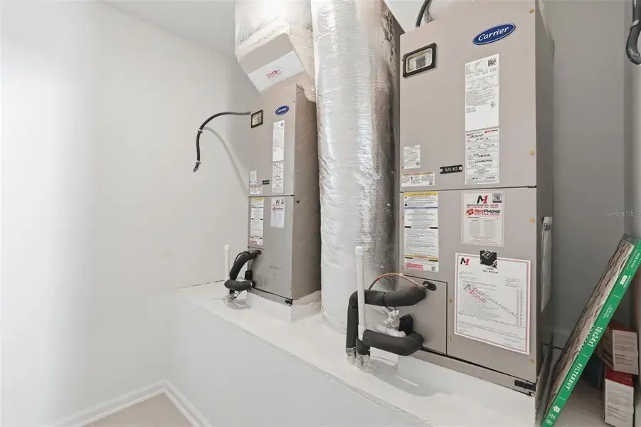 Additional features include washer and dryer, 2” faux wood blinds, ceramic tile flooring in main areas, luxury vinyl floors on 2nd floor, carriage-style garage doors, irrigation system, automatic garage door opener, and built-in pest control system. Energy-efficient features include low-E windows, programmable thermostat, LED lighting, and an efficient electric heat pump.