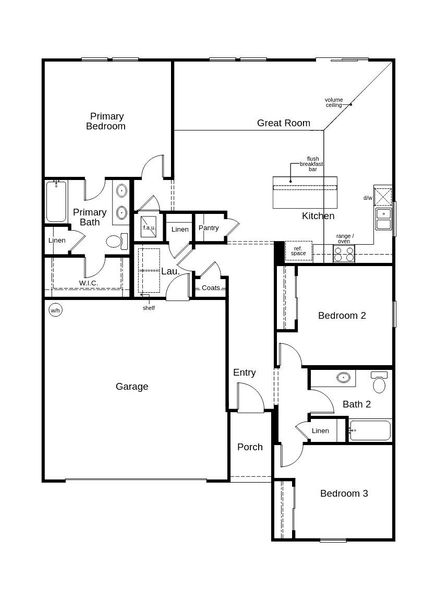 This stunning, single-story home showcases a covered entry and professional landscaping for extra curb appeal. Inside, discover an open floor plan with volume ceilings and a spacious great room. The modern kitchen boasts Woodmont® cabinets, laminate countertops, an island and Whirlpool® stainless steel appliances. Relax in the primary suite, which features a walk-in closet and connecting bath that offers quartz countertops, a dual-sink vanity, linen closet and tub/shower combination. Other highlights include ENERGY STAR® certified lighting, Moen® faucets and Kohler® sinks.